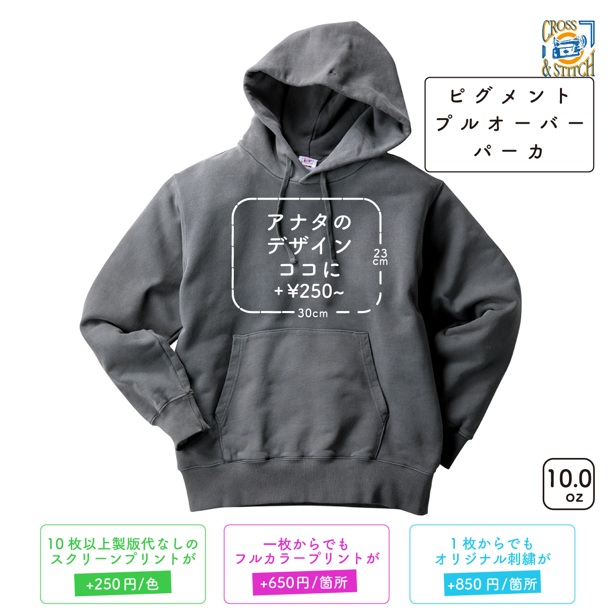 Pigment-dyed fleece hoodie! The backing yarn is OE (open-end yarn) for a crisp feel.