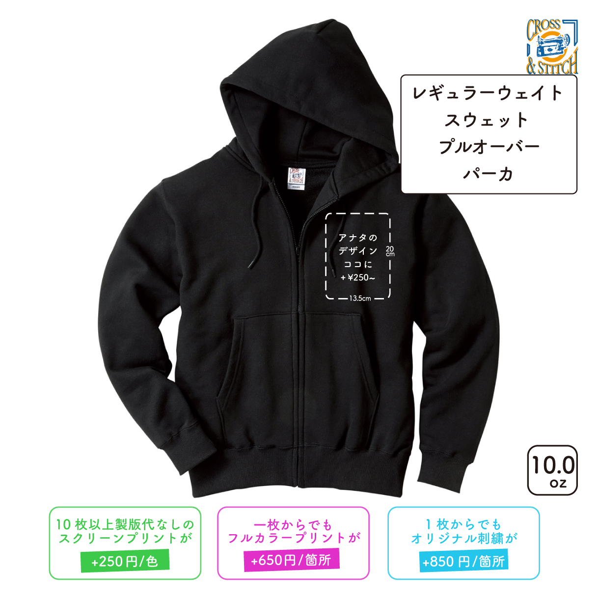 CROSS STITCH's 10oz Regular Zip Hoodie features a three-dimensional silhouette and a wide range of color sizing. Enjoy the sizing that fits the Japanese body type!