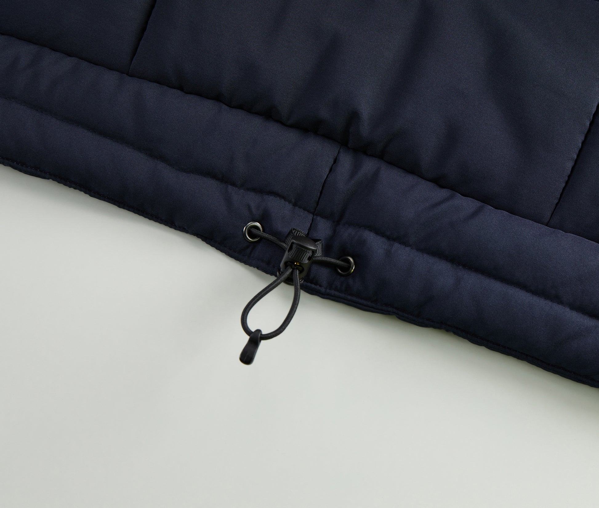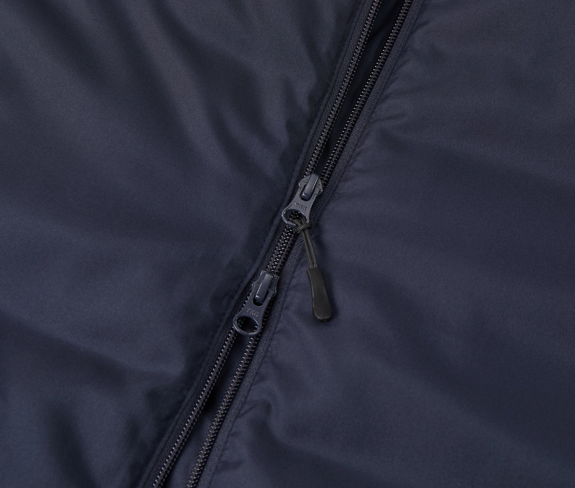 ミリタリーアウターをルーツに持ちながら、日常でも着まわせるようにデザインされた中綿ジャケット。首もとはスタンドネック仕様で、チンガード付きのフロントファスナーはYKK社製のダブルスライダータイプ。防風性と着こなしの自由度を両立しています。